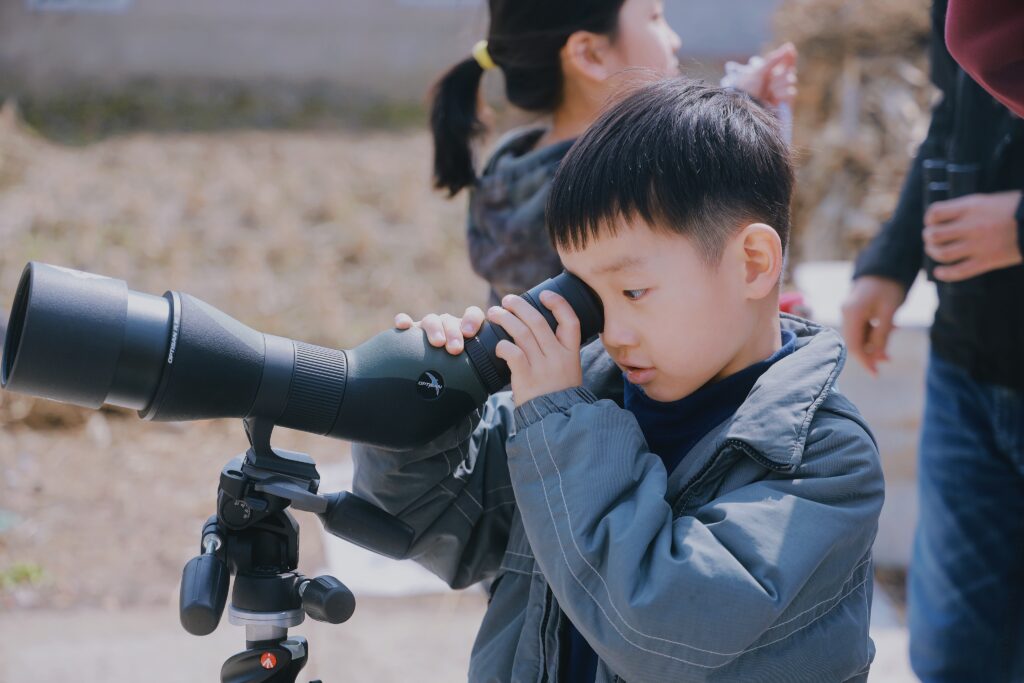 重量上也要注意,如果是賞鳥使用,可能會往上舉起望遠鏡持續觀察,需要觀察兒童舉起望遠鏡是否能拿穩、是否晃動?在小朋友無法全程拿穩以前,可以家長與小朋友共用,觀察兒童的使用狀況。